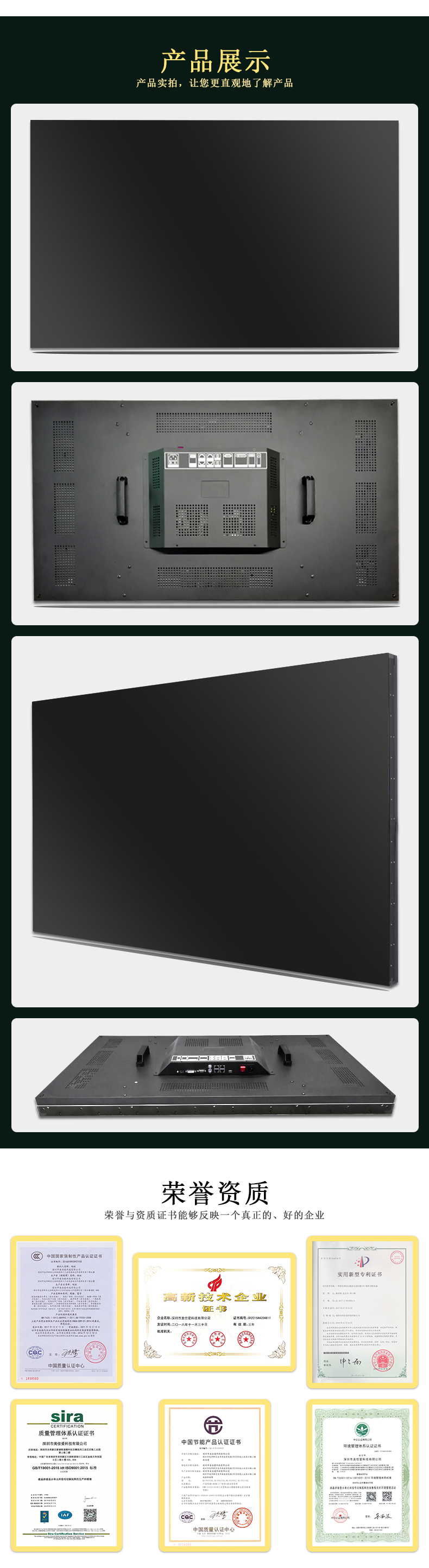 【美佳愛-4k液晶拼接屏生產廠家電話400-997-9971】京東方46寸液晶拼接屏-拼縫3.5mm產品通過ISO9001_3C_節能認證等30多項認證,主營LG/京東方/三星大屏幕電視墻,其尺寸有32寸40寸43寸46寸49寸55寸65寸75寸液晶拼接單元,也有曲面,弧形,柔性,無縫LED顯示屏,顯示器,超窄邊高清監視器,提供企業展廳展示,KTV,酒吧,會議室,視頻監控系統解決方案設計-報價-安裝施工-售后超窄邊維修等服務