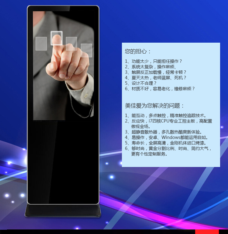 【深圳市美佳愛-液晶廣告機,觸摸一體機生產廠家電話400-997-9971】43寸紅外觸摸一體機(安卓/立式)產品通過ISO9001_3C認證,主營多點紅外/電容式觸摸屏一體機,觸控查詢一體機,其他尺寸18.5寸21寸24寸27寸32寸40寸43寸46寸49寸55寸65寸75寸86寸98寸100寸多功能多媒體教學會議一體機,戶外立式/壁掛雙面廣告機,單機版/安卓網絡廣告機 豎屏樓宇電梯廣告機,長條型屏,工業級工控電腦觸摸顯示器,大尺寸觸摸屏查詢系統,商顯平板電腦電視,提供報價價格,安裝施工,售后維修等